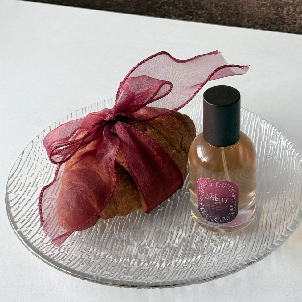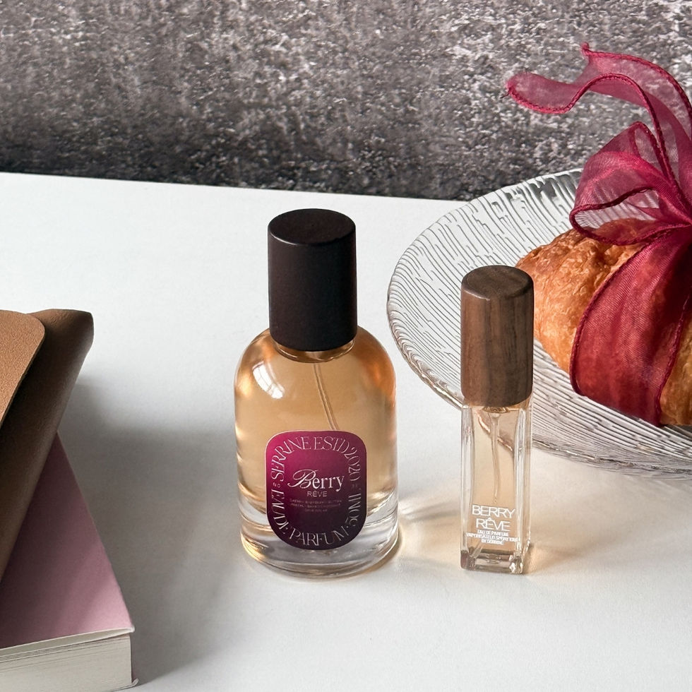 Berry Rêve opens with crushed raspberry and cherry notes that melt into the buttery layers of a croissant just out of the oven. As the scent drifts through the air, a trace of sweetness and warmth lingers like pastry filled with fruit, cooling on a tray. Sweet, tart, and mouthwatering.